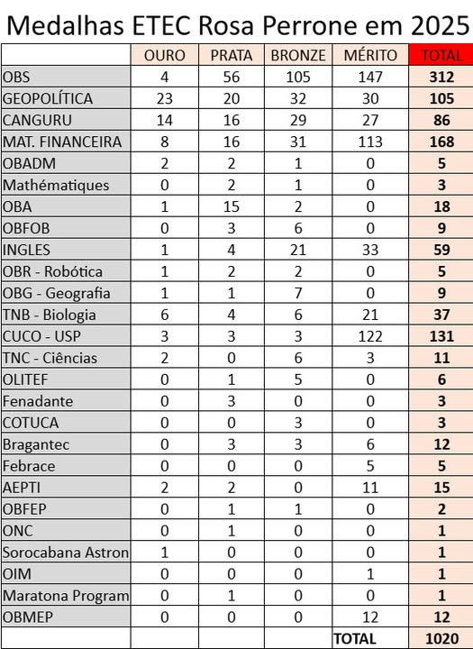 1.020 medalhas e méritos conquistadas em Olimpíadas, Feiras e Competições Nacionais e Internacionais!